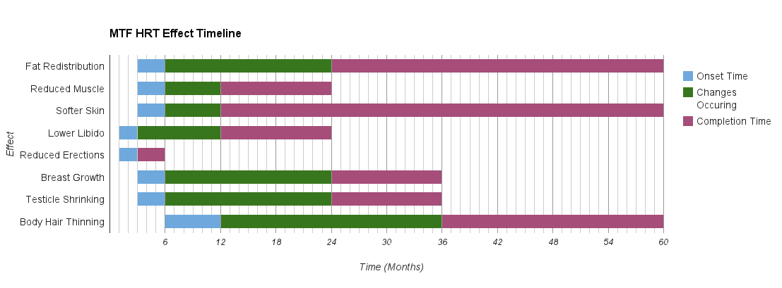 A few months into HRT, I began noticing a lot of tenderness in my chest; I now understand why a lot of teen girls develop poor posture and walk with their arms folded over their chest. Soon after that, I noticed some growth in that area. This development produced one of the bigger surprises of my transition. After I noticed my growth, I realized that I was now able to identify something that I’d felt before, but had never understood (or could even have described). My breasts were (and are) important to me! And not in a prurient way; they felt like an integral part of me – something which absolutely belonged. I realized that I had been feeling their absence all my life, and that since my brain had subconsciously expected them to be there (and they weren’t), it was distressed. Perhaps a good way to describe it is to compare it to Phantom Limb syndrome (where amputees experience sensations with the missing body part) – I felt something, but having never had breasts, I’d never learned to associate the feelings with that part/area. I’d been missing them, both mentally and physically, my whole life! Having the right parts there has brought immense relief!