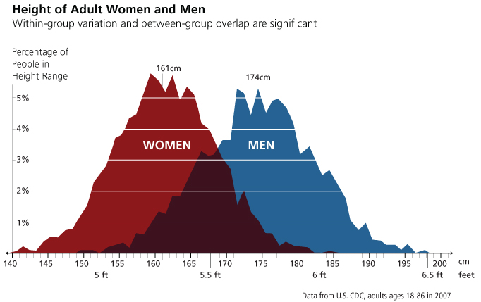 But there’s the rub: sex doesn’t conform to human definitions either. While many people think that there are two sexes – male and female – the reality is that sex falls on a spectrum (just like gender, imagine that!), where the majority of humans fall within the two humps of a bimodal distribution, there are overlaps between the two humps (see figure  above, showing one characteristic – height), and there are humans all along the spectrum.