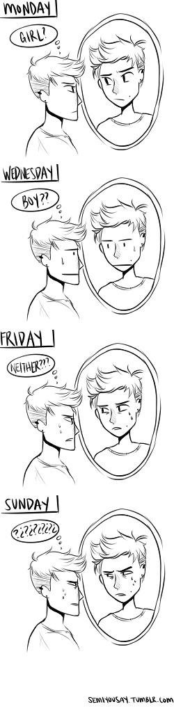 Four vignettes of a person looking in the mirror. On Monday, the person thinks “Girl?”. On Wednesday, “Boy??”. Friday: “Neither???”. Sunday “????????”