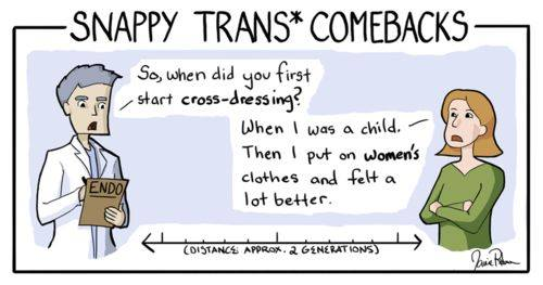 Snappy Trans* Comebacks: "So when did you first start cross-dressing?" "When I was a child. Then I put on *women's* clothes and felt a lot better." [Timeline: (Distance: approx. 2 generations)]