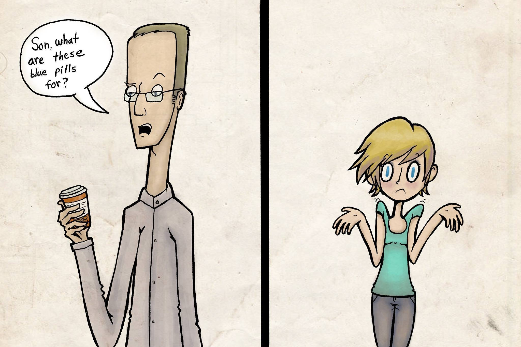 Father asks his child “Son, what are these blue pills for?”, and the child (appearing a bit feminine) shrugs in reply.