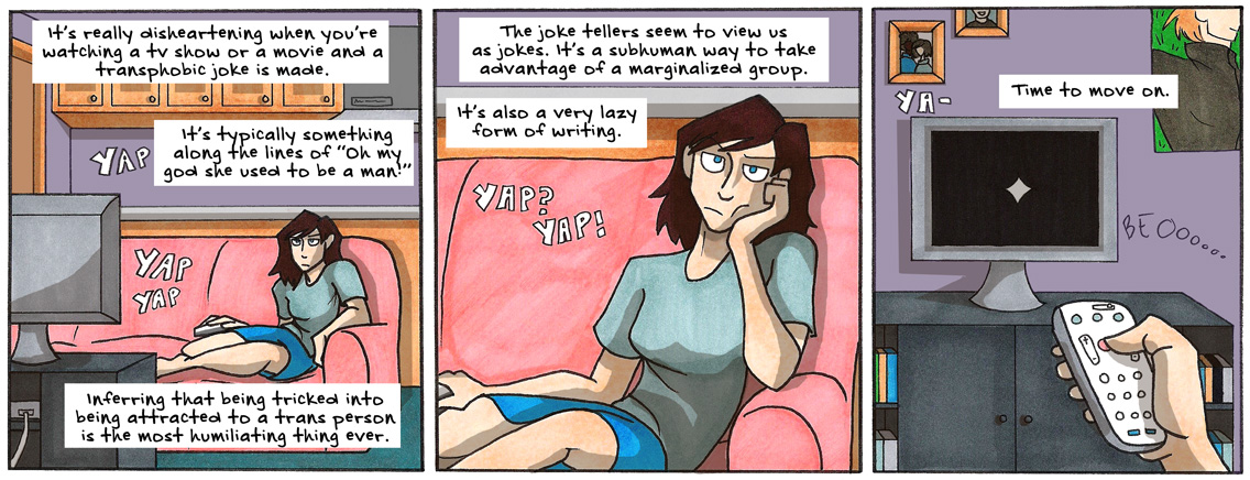 It's really disheartening when you're watching a tv show or a movie and a transphobic joke is made. It's typically along the lines of "Oh my god she used to be a man!" Inferring that being tricked into being attracted to a trans person is the most humiliating thing ever. / The joke tellers seem to view us as jokes. It's a subhuman way to take advantage of a marginalized group. It's also a very lazy form of writing. / Time to move on.