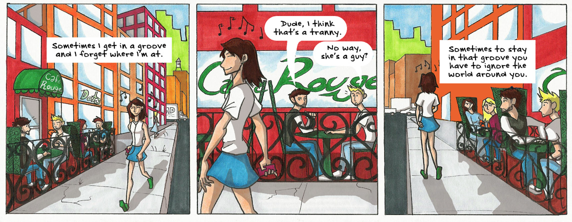 Sometimes I get in a groove and I forget where I'm at. / "Dude, I think that's a tranny." "No way, she's a guy?" / Sometimes to stay in that groove you have to ignore the world around you.